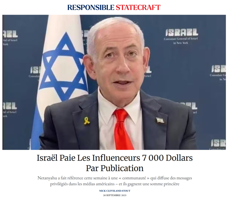 Benjamin Netanyahu a évoqué dans l'entretien cité plus haut, une « communauté » d'influenceurs pro-israéliens actifs dans les médias américains. Ces influenceurs sont rémunérés pour diffuser des contenus favorables à Israël sur les réseaux sociaux.