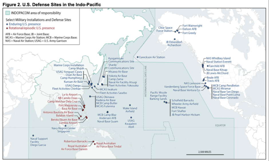 Par exemple, l'Initiative de dissuasion du Pacifique, établie par la NDAA de 2021 et renforcée dans toutes les suivantes, est le principal moyen par lequel le Pentagone militarise le Pacifique. Il se concentre sur la construction d'infrastructures militaires dans le Pacifique, l'achat et le placement d'armes là-bas, l'expansion de la formation et des exercices militaires là-bas, et la promotion et la cooptation des dirigeants régionaux.