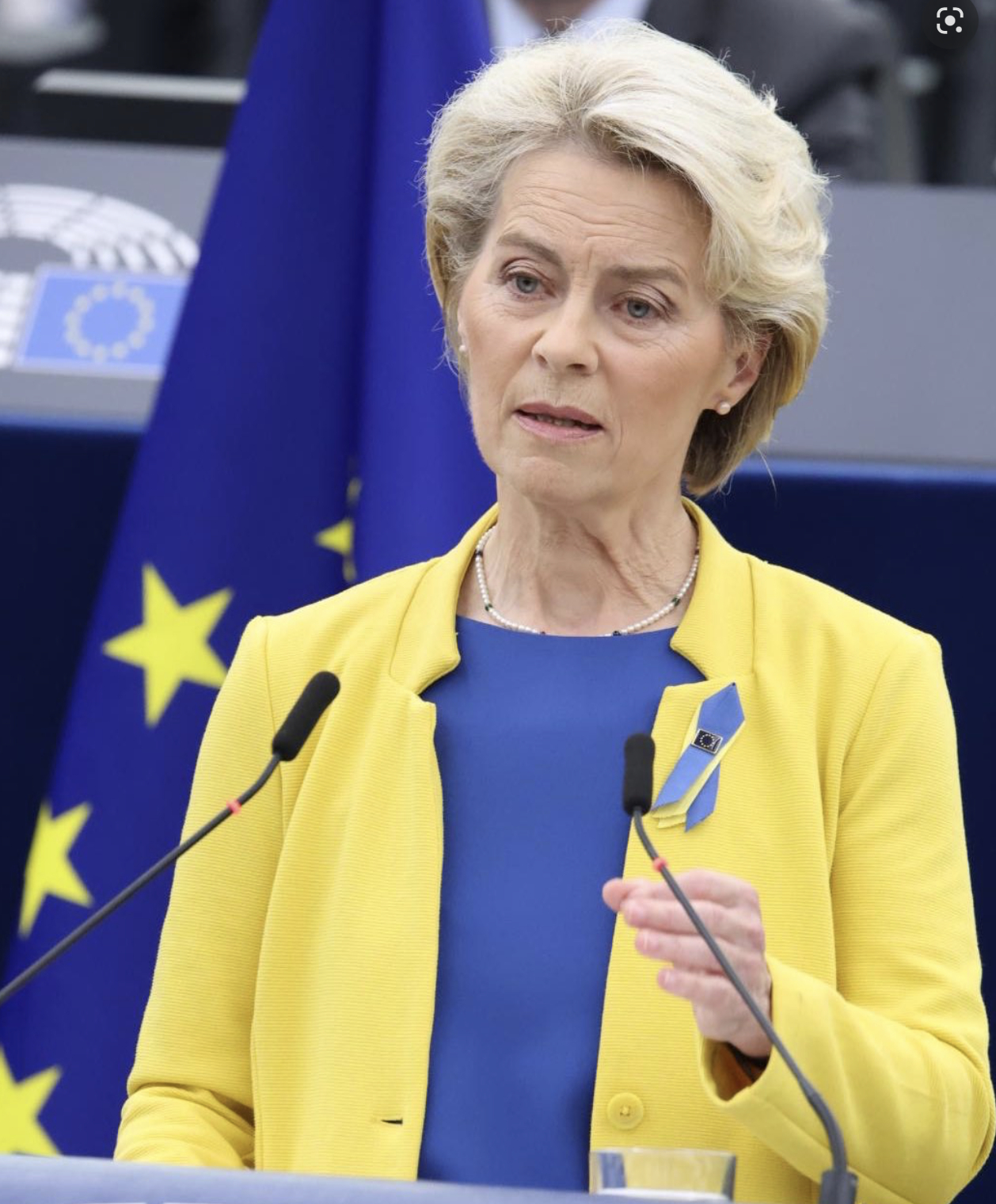 Lorsqu'elle est nommée le 16 juillet 2019 présidente de la Commission, sans l'appui d'Angela Merkel (elle obtient 51% des voix, élue grâce aux suffrages d'extrême droite des Polonais de Droit justice et de ceux ambigus du Mouvement 5 étoiles), elle est auditionnée par les groupes du Parlement européen. Á noter qu'elle prononce son premier grand discours en anglais, qui n'est que la seconde langue de la République d'Irlande. Selon Le Point, elle en reste à des généralités qui ne mangent pas de pain. Elle permet aux Britanniques de négocier leur Brexit pendant le temps qu'ils voudront, ce qui a le don d'irriter notre banquier jet-skieur. Elle se dit favorable à un salaire minimum, mais également à l'entrée de la Moldavie où le smic est à 42 euros par mois... Ursula est bien au-dessus de ses considérations, elle qui emprunte à tour de bras des avions privés sur des petites distances.