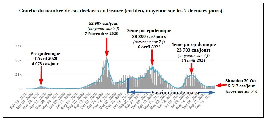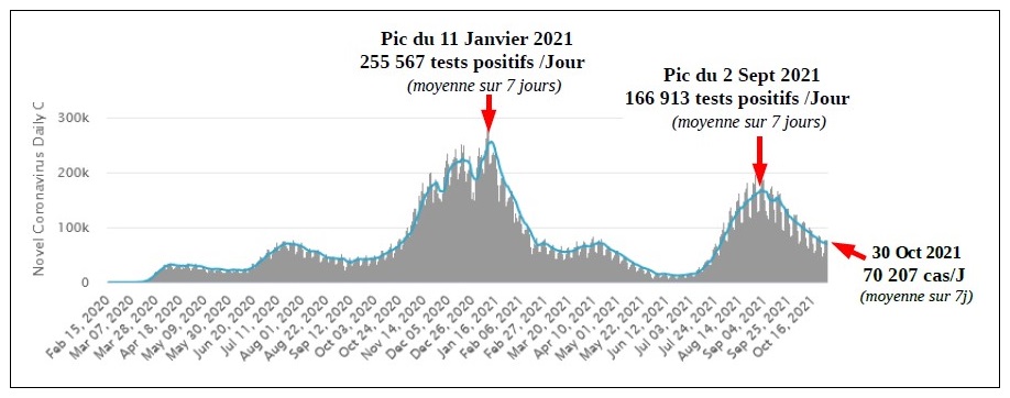 Le 29 octobre 2021, après 7 milliards de doses vaccinales injectées, la planète enregistre 427 690 nouveaux cas/jour et 7066 décès/jours (moyenne des 7 derniers jours). Cette évolution du nombre des décès est d'ailleurs aujourd'hui en hausse.