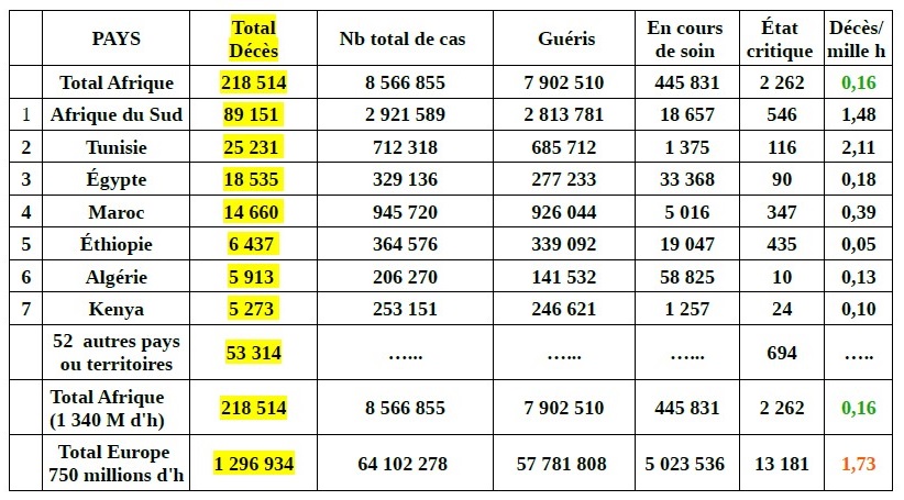 La mortalité liée au Covid y reste dérisoire et s'améliore un peu partout y compris en Afrique du Sud où la contamination -19% en 1 sem) et la mortalité -21%) diminuent. Tous les indicateurs restent bons.
