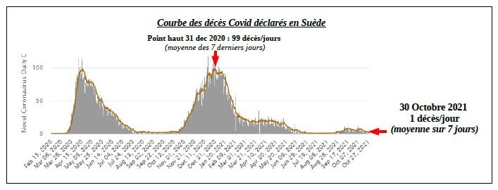 1 - En Suède, aucune des prédictions apocalyptiques des experts autoproclamés ne s'est réalisée. 96 000 décès en un seul mois prévus par les « experts » ? Dans la vraie vie, 14 991 décès en vingt un mois, bilan réalisé sans aucune des mesures folles que la France a connues. La Suède, plus contaminée, plus âgée et moins vaccinée que la France est sortie de l'épidémie depuis quatre mois, dans la sérénité, alors même que la France continue d'y patauger.