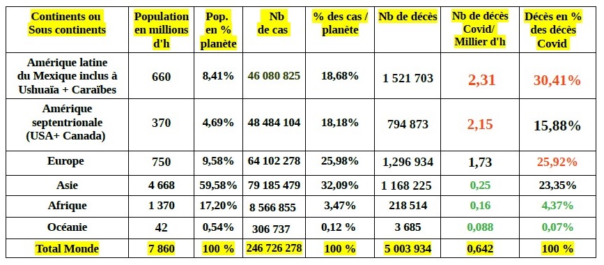 À la lecture du tableau qui suit, on réalise à quel point la mortalité reste faible et baisse en Afrique, et en Océanie, plus forte mais en baisse en Amérique latine (Brésil, Mexique) et en Amérique septentrionale, plus forte et en hausse en Asie (Inde), et surtout en Europe. L'Europe est redevenue l'épicentre actuel de l'épidémie devant, avec l'arrivée de l'hiver dans l'hémisphère Nord.