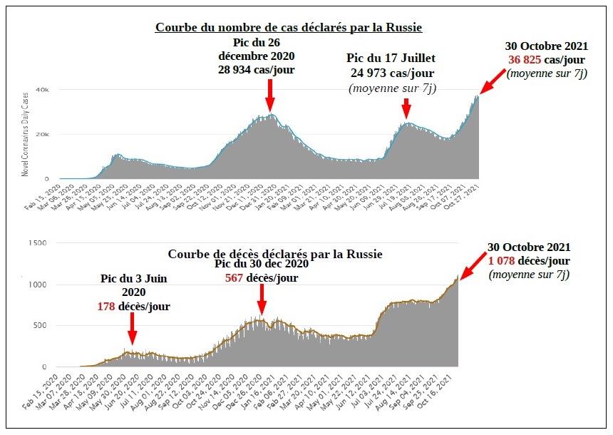 La Russie continue de déclarer, à elle seule, plus de 36% des décès européens. Les indicateurs montrent que le niveau de mortalité du 3ème pic épidémique russe ne veut toujours pas baisser.