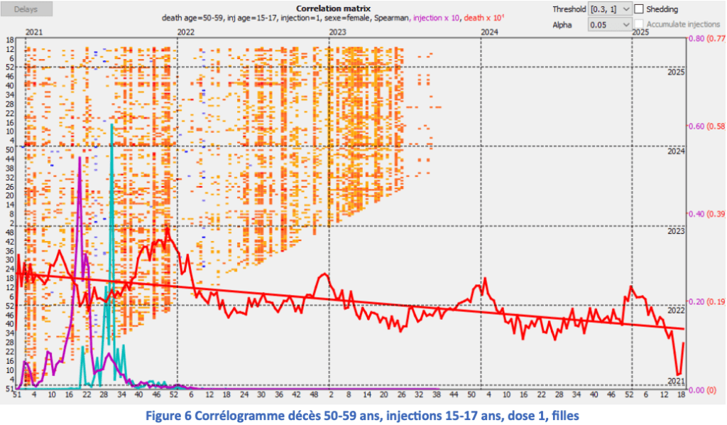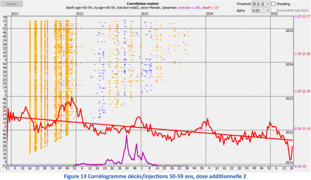 Des analyses de corrélation décès toutes causes/injections, stratifiées selon l'âge, montrent des associations positives très nombreuses entre la mortalité hebdomadaire et les injections hebdomadaires pour toutes les tranches d'âge, (corrélations directes), mais aussi entre les tranches d'âge (corrélations indirectes), suggérant des effets indésirables sur les personnes en contact avec les injectés. Ces effets sont appelés effets de halo, alloeffects, excrétion vaccinale, vaccine shedding (Seligmann 2021 (1) ; Pantazatos and Seligmann 2021 (2). Un long article d'Hélène Banoun (3) présente une synthèse de l'état des connaissances à la date de l'article. Il est également possible de retrouver un grand nombre de références dans l'article du média Dépêches citoyennes (4). Plusieurs études récentes ont à présent montré ces phénomènes. Nous citerons «Shedding vaccinal (alloeffects) des injections COVID-19 associé avec la mortalité toutes causes européennes (Jan 2021 - Oct 2023), la synergie entre les injections COVID-19 sur différentes personnes, les décès par cancer de femmes injectées en relation avec les injections des adolescents» (5). Cette nouvelle étude présentera des résultats montrant les effets directs et indirects sur la mortalité.