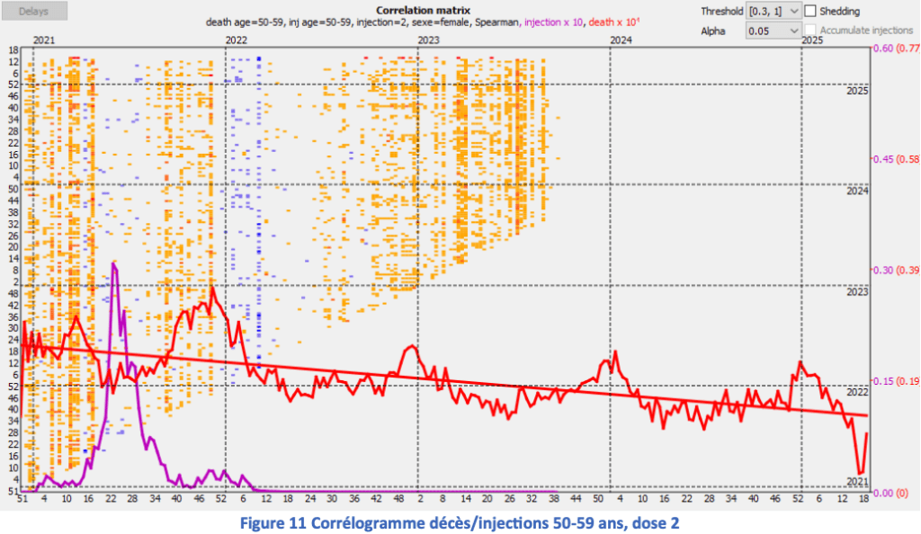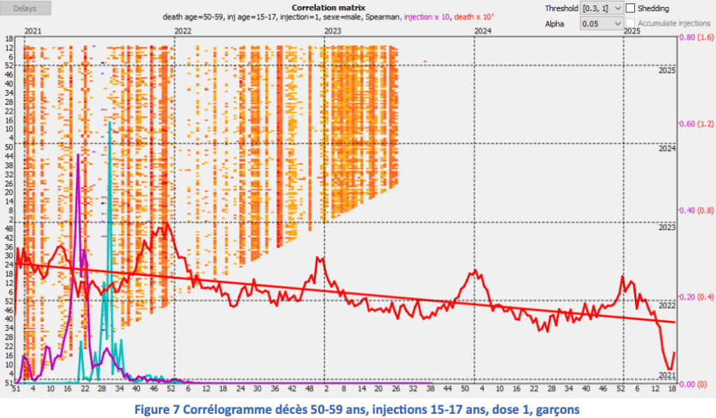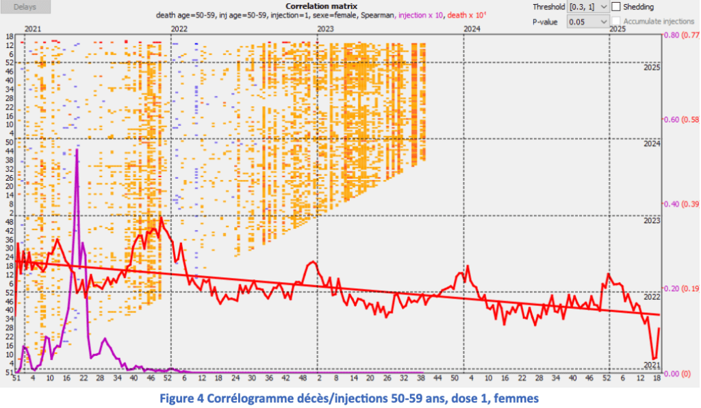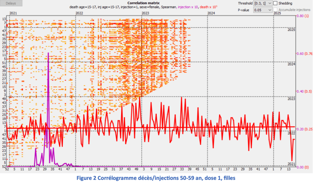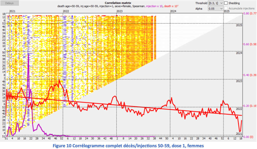 Cet ensemble de données nous permet de calculer 2800 matrices de corrélations (10 tranches d'âges, 7 doses, 2 sexes, 2 méthodes) (9). Chacune des matrices de corrélation contient les corrélations décès/injections d'une tranche d'âge avec les injections d'une tranche d'âge (la même ou une autre), pour chacune des 220 semaines. Nous avons ainsi, par matrice, pour chaque semaine de décès, les corrélations décès/injections la même semaine et toutes les injections des semaines antérieures. **** Méthode de Pearson et Spearman.