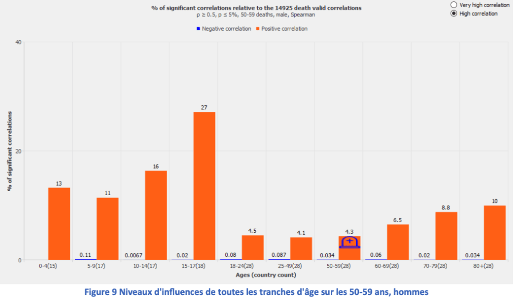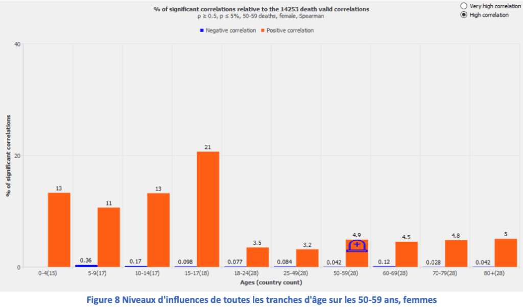 Nous remarquons que pour les décès des 50-59 et les injections aux 15-17 ans, les corrélations aussi sont extrêmement marquées, et même plus nombreuses et plus fortes que les injections directes. Nous constatons l'influence des injections d'une tranche d'âge sur les mortalités d'une autre tranche d'âge. La courbe magenta représente les injections aux 50-59 ans, et la courbe cyan correspond aux injections aux 15-17 ans. Pour la tranche d'âge 50-59 ans, nous pouvons résumer l'effet de halo dû aux différentes tranches d'âge. Nous avons compté le nombre de dates où les corrélations sont significatives rapporté au nombre de dates calculables. Nous voyons immédiatement que pour les doses 1, la contribution des 15-17 ans est la plus importante. Nous voyons également que les injections aux tranches d'âge jeunes conduisent à des corrélations beaucoup plus nombreuses que les injections aux tranches d'âge supérieures. Que dire du slogan «Vacciner les jeunes pour protéger Papi et Mamie» ?