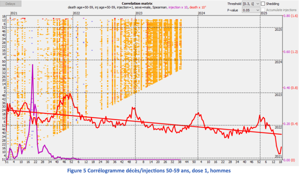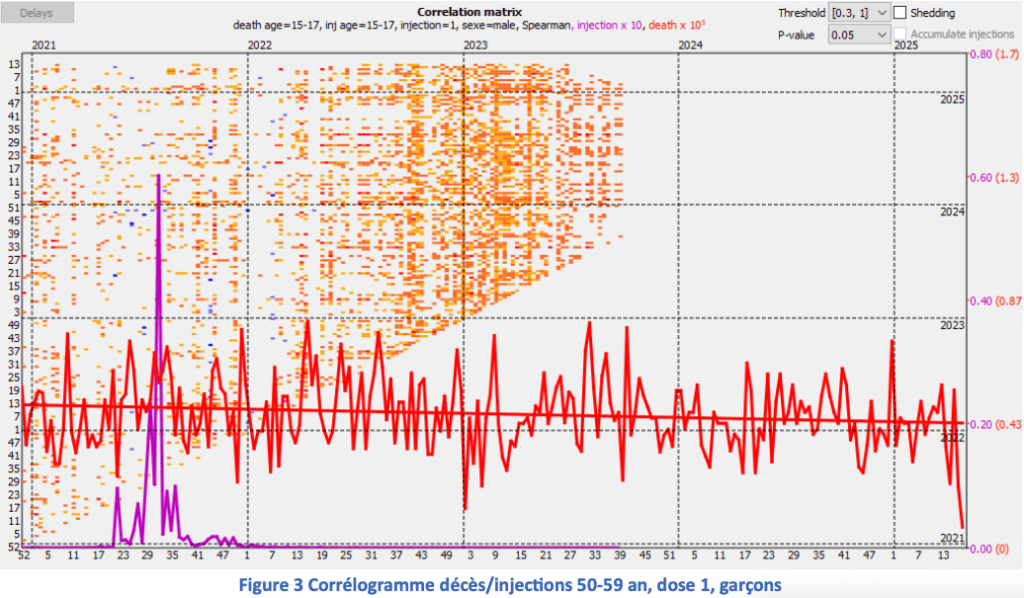 La combinaison des données hebdomadaires de mortalité toutes causes confondues et d'injection contre la COVID-19 stratifiées selon 10 classes d'âge* distinctes, débutant fin décembre 2020, pour un maximum de 28 pays** européens, 7 doses***, par sexe et plus de 200 semaines, permet d'explorer les associations entre les taux de mortalité toutes causes confondues et les injections, au sein et entre les classes d'âge, ainsi que les délais entre l'injection et le décès.