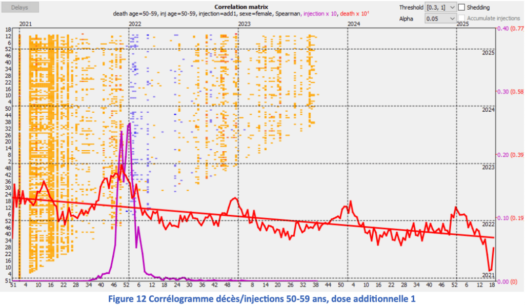 Pour cette tranche d'âge aussi, le nombre de corrélations négatives est pratiquement nul. Le pic d'injections semaine 20 de 2021 est éloigné des premières bandes de décès de plus de 20 semaines. La courbe des décès, courbe rouge, montre bien l'augmentation des décès pendant l'hiver. La répartition temporelle des corrélations ne semble pas correspondre à ces augmentations de la mortalité. La première bande orange (semaine 45 de 2021) peut peut-être correspondre, mais c'est probablement un hasard. Nos calculs ne semblent pas du tout liés à une surmortalité due aux décès hivernaux. La mortalité due aux injections n'est pas visible sur la mortalité générale, mais les corrélations montrent qu'elle est bien présente.