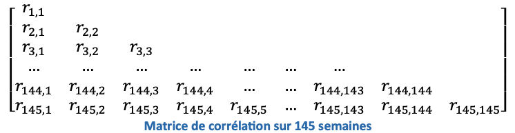 En posant r le coefficient de corrélation de Pearson que nous pouvons remplacer par la lettre ρ du coefficient de corrélation de Spearman, et en choisissant par exemple l'indice 1 pour la semaine 51 de 2020 et l'indice 145 pour 145 semaines plus tard, nous obtenons la matrice ci-dessous. Chaque extrémité droite de chaque ligne (les termes de la diagonale) est le coefficient de corrélation des décès/injections pour la même semaine (𝑟1,1, 𝑟2,2,..., 𝑟145,145). Les termes à gauche représentent le coefficient de corrélation décès/injections pour les semaines antérieures au décès.