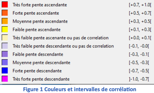 Dans cette étude, les matrices de corrélation seront représentées à l'aide d'un corrélogramme. À chaque coefficient est affectée une couleur. Pour limiter le nombre de couleurs, nous avons choisi d'affecter une couleur relative à la force de la corrélation. Chaque couleur représente donc un intervalle de valeurs.