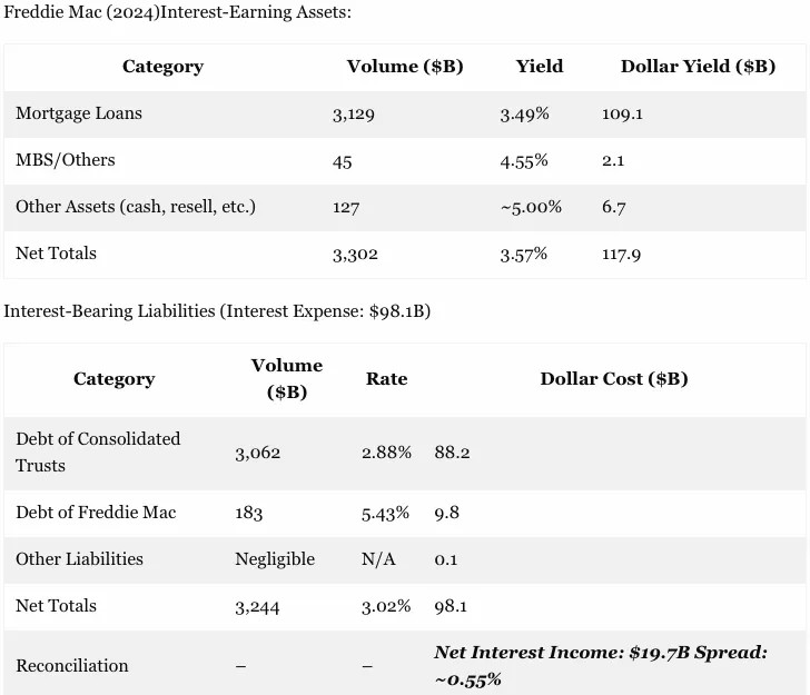 Stated differently, pretax profit would have been about $42 billion in 2024, representing a 57 basis points against the $7.4 trillion of assets. On the other hand, without Uncle Sam's sovereign credit rating Freddie and Fannie would easily pay 50 to 100 basis points more than the 2.90% they paid on its interest-bearing liabilities in 2024.