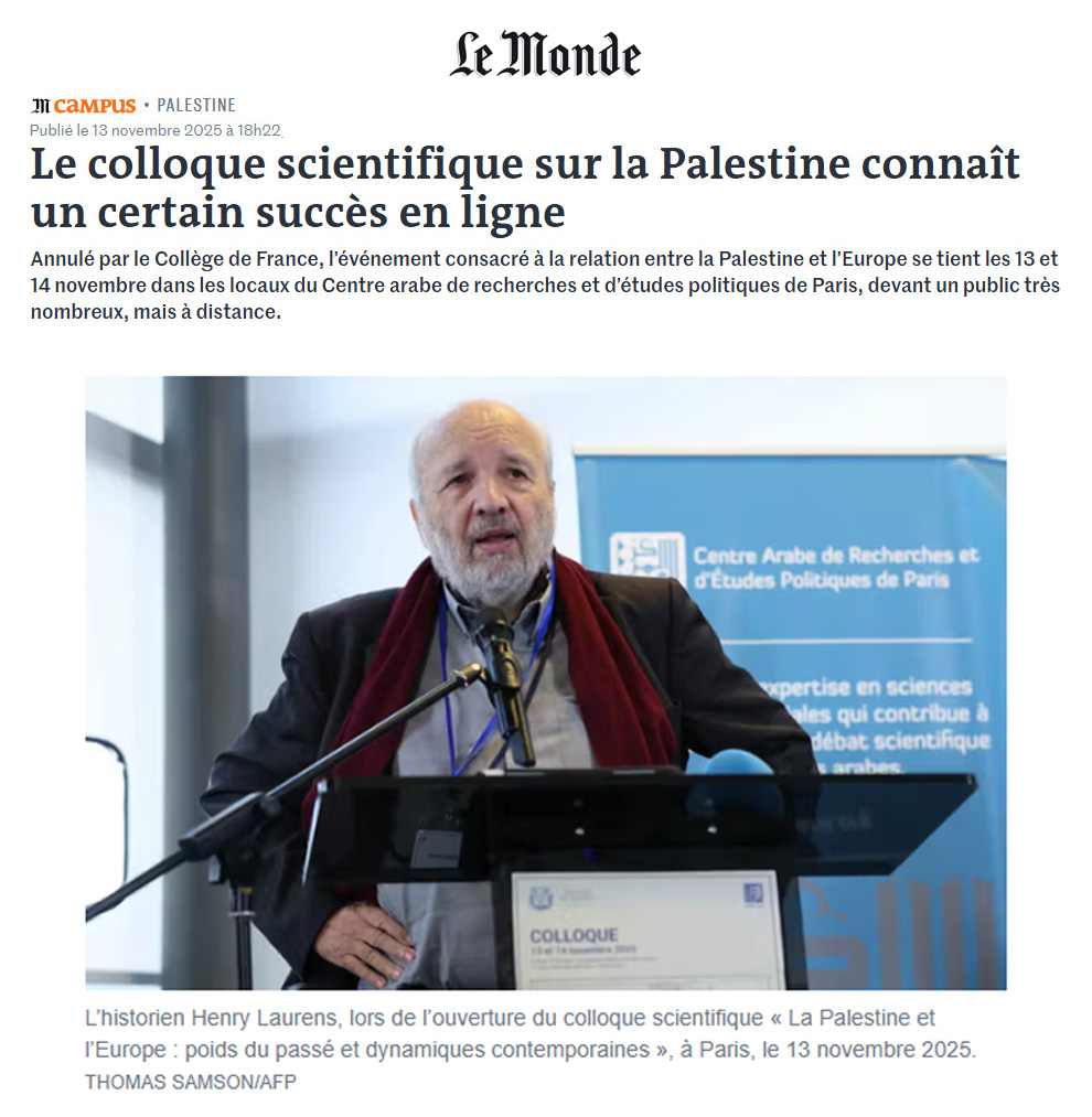 - Rappel des faits : Le colloque sur la Palestine prévu au Collège de France les 13 et 14 novembre 2025, intitulé « La Palestine et l'Europe : poids du passé et dynamiques contemporaines », a été annulé à la dernière minute par l'administration de l'établissement, suite à une vive polémique et à des pressions externes liées à sa prétendue nature « propalestinienne » et « antisioniste ».