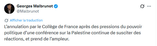 L'annulation par le Collège de France après des pressions du pouvoir politique d'une conférence sur la Palestine continue de susciter des réactions, et prend de l'ampleur.