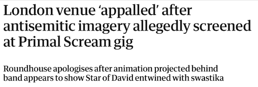 Take the following absurd headline from the paper: "London venue 'appalled' after antisemitic imagery allegedly screened at Primal Scream gig."