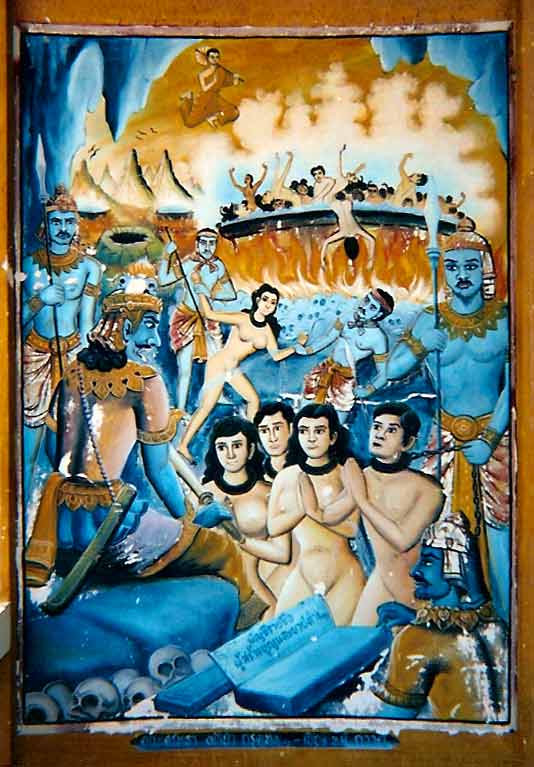 Une fresque murale d'un temple du nord de la Thaïlande. Les esprits nus des morts sont amenés devant Yama pour être jugés. Phra Malaya observe d'en haut les êtres qui sont frits dans un grand chaudron d'huile. Source.