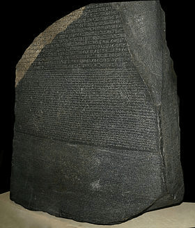 La pierre de Rosette qui a été accaparée par des membres de l'armée napoléonienne en 1799 lors de la campagne d'Égypte a été déchiffrée en 1822 par Jean-François Champollion. Elle se trouve aujourd'hui au British Museum à Londres. Le travail de traduction a été facilité par le fait que la pierre présente le même texte en trois langues : l'égyptien ancien, l'égyptien populaire et le grec du temps d'Alexandre le Grand.