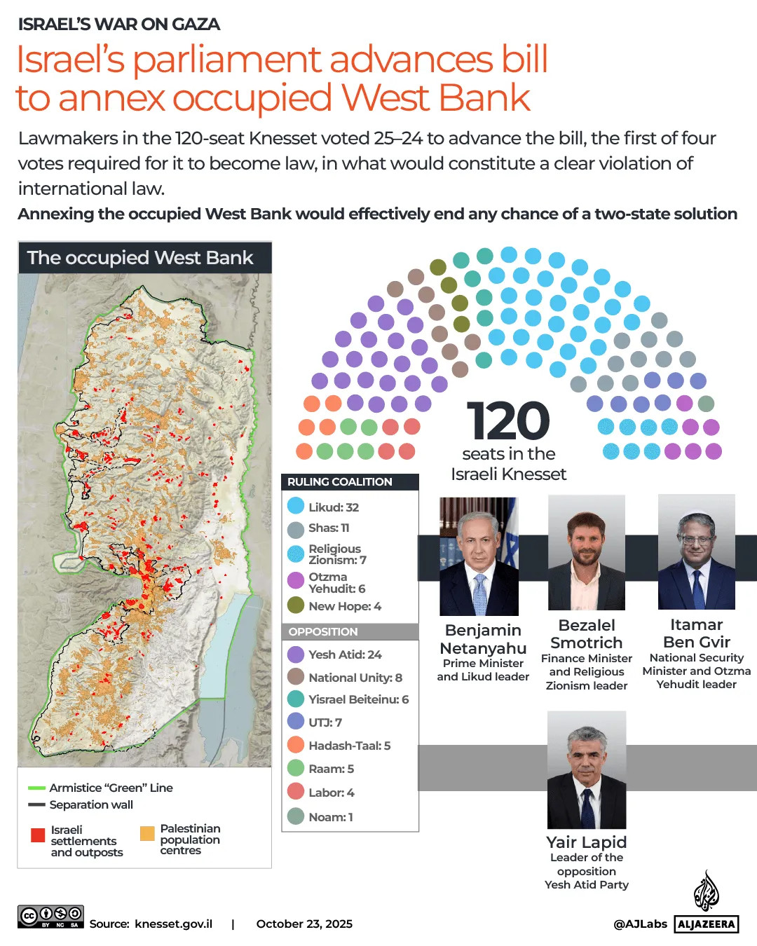 Al Jazeera, 22 octobre 2025.- Le projet de loi a été adopté par 25 voix contre 24, malgré l'opposition du Premier ministre Netanyahou, lors du premier des quatre votes nécessaires à son adoption.