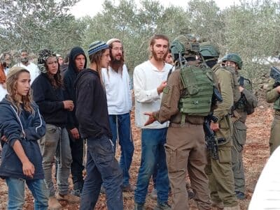 Une annexion qui existe déjà sur le terrain. Ici colons et soldats israéliens unis pour empêcher les Palestiniens de récolter leurs olives, à Beita, le 10 octobre 2025.