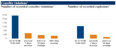 La  mission spéciale d'observation de l'OSCE à la ligne de cessez-le-feu dans le sud-est de l'Ukraine a fait un compte rendu du  samedi 19 février 2022 et du dimanche 20 février 2022 sans séparer les deux jours dans sa description verbale. Cependant, le graphique montrant le nombre d'incidents observés, joint au rapport, sépare les deux jours. Le nombre total de violations du cessez-le-feu et d'explosions samedi a de nouveau augmenté par rapport à la journée précédente. Des échanges d'artillerie ont eu lieu sur de nombreuses parties du front.