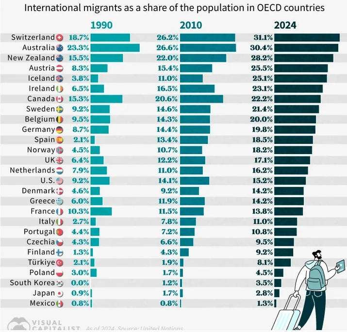 The chart tells a story of which countries have embraced the mass suicide of their culture and those still resisting. The chart reveals the number of immigrants, but not where they came from and whether they arrived legally. So, Switzerland has the largest number of immigrants and a 66% increase since 1990, but the vast majority are from other European countries, as only 2% of their population are African. Iceland is another similar example, as the number of immigrants since 1990 has increased by a factor of six, but Africans still make up less than 1% of their population.