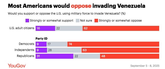 D'après un sondage YouGov publié le 31 octobre, les Américains sont réticents à soutenir un déploiement naval autour du Venezuela. Ils sont davantage enclins à rejeter qu'à approuver des attaques militaires contre des vedettes rapides et des cibles terrestres. L'opposition au renversement violent du président Maduro s'intensifie.