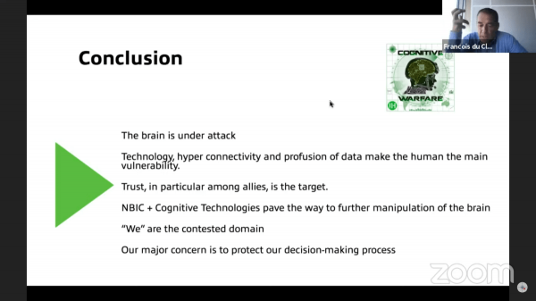 Du Cluzel a résumé ses recherches lors du panel d'octobre dernier. Il a commencé ses remarques en notant que la guerre cognitive « est actuellement l'un des sujets les plus brûlants pour l'OTAN » et « est devenue un terme récurrent dans la terminologie militaire au cours de ces dernières années. »