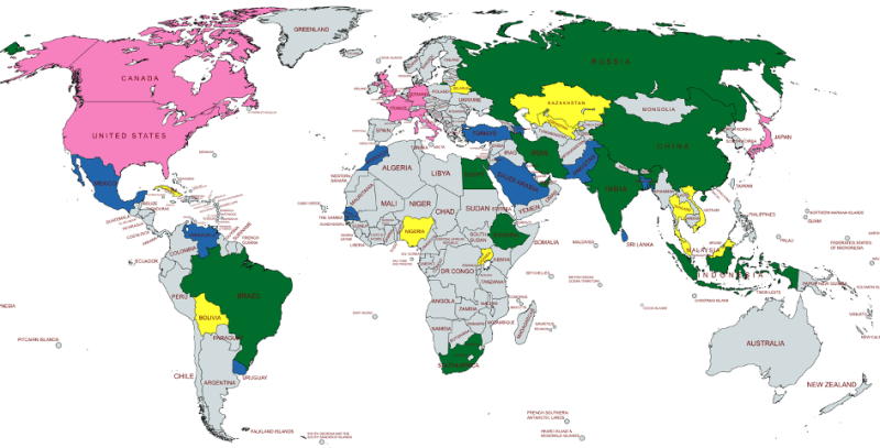 Membres du G7 - rose ; membres du BRICS - vert ; partenaires du BRICS - jaune -
