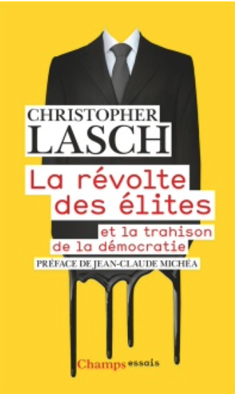 premier est évidemment celui Christopher Lasch, 'La révolte des élites et la trahison de la démocratie' (1994). Dans ce livre-testament, il défend l'idée que la démocratie n'est plus menacée par les masses, mais par ceux qui sont au sommet de la hiérarchie, nous dit Wikipedia. Lasch constate que :