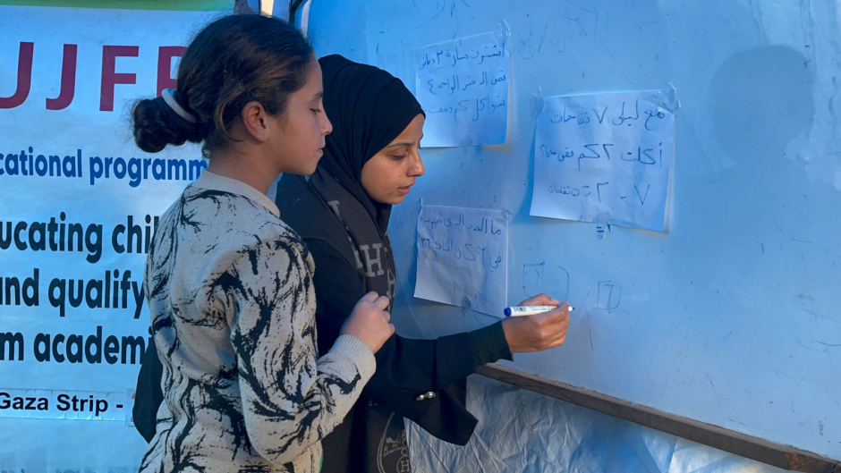 Le Centre éducatif Al-Fajr, situé dans la région d'Al-Mawasi à Khan Younès, accueille encore un grand nombre d'enfants qui y trouvent un espace sûr pour apprendre et s'exprimer. Il sert les enfants d'agriculteurs qui ont été déplacés et ont perdu leurs terres, leurs maisons et leurs moyens de subsistance, mais qui refusent de renoncer à l'avenir éducatif de leurs enfants, faisant de ce centre une lueur d'espoir dans une réalité extrêmement difficile.