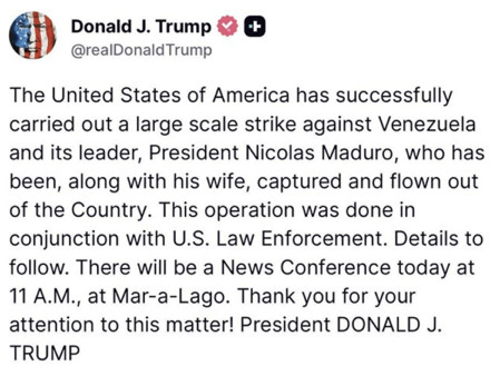 Via sa plateforme Truth Social, Donald Trump a revendiqué la victoire. Selon le président américain, Nicolás Maduro et son épouse Cilia Flores ont été  capturés et exfiltrés du pays. « Les États-Unis ont mené avec succès une attaque de grande ampleur », a déclaré Trump. Il a annoncé une conférence de presse plus tard aujourd'hui dans son complexe de Mar-a-Lago.