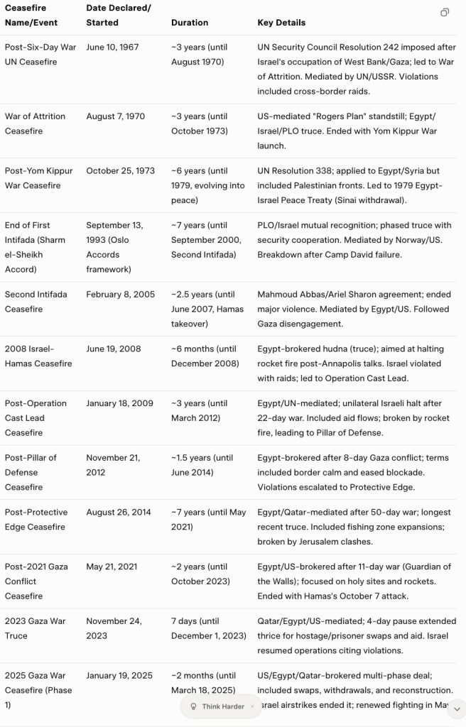 Judging from history, there is no chance that this agreement produces the peace that Donald Trump envisions. Since the 1967 Six-Day War, the Israeli-Palestinian conflict has seen numerous ceasefires (also called truces, hudnas, or armistices), primarily involving Israel and Palestinian groups like the PLO, Fatah, Hamas, and Palestinian Islamic Jihad (PIJ). These are often mediated by the UN, Egypt, Qatar, or the US and tend to follow escalations such as wars, intifadas, or Gaza operations. "Declaration" typically refers to formal agreements between the parties, though some are unilateral or UN-imposed.