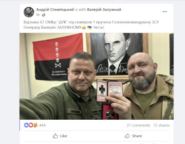 A day before being fired as the commander of the Ukrainian army Zaluzhny took a selfie with the leader of the fascist Right Sector and commander of Right Sector brigade of Ukrainian military in front of a portrait of Nazi collaborator Stepan Bandera and the fascist OUN flag.