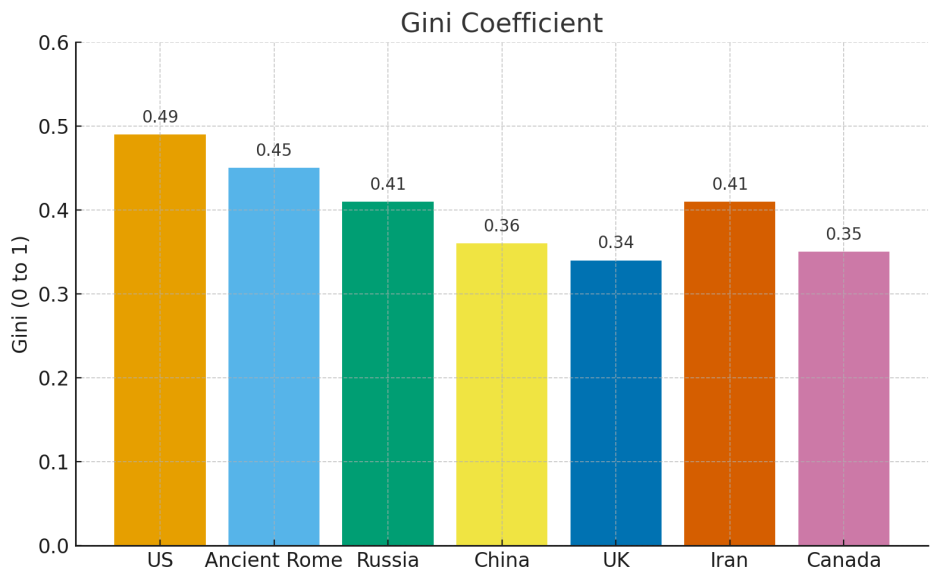 The Gini Coefficient is a measure of inequality in a society where 0 represents perfect equality and a score of 1 represents perfect inequality. Although there's no hard-and-fast rule, when it gets over a certain point, revolution becomes highly likely. Well, hang on to your pantaloons - the U.S. currently has a Gini Coefficient worse than Ancient Rome before its collapse.