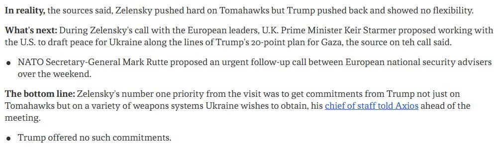 La priorité numéro un de Zelensky lors de sa visite était d'obtenir des engagements de Trump non seulement sur les Tomahawks mais sur une variété de systèmes d'armes que l'Ukraine souhaite obtenir, a déclaré son chef de cabinet à Axios avant la réunion.