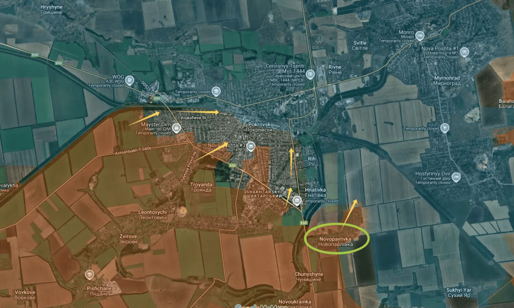 Les changements les plus profonds se sont peut-être produits à Pokrovsk même, ou comme on l'appellera bientôt, Krasnoarmeïsk. Les forces russes ont non seulement pris le village de Novopavlovka, dans la banlieue sud (à ne pas confondre avec Novopavlovka, plus ancienne et beaucoup plus grande) - entouré en vert ci-dessous - mais elles ont également percé les parties occidentales de la ville de Pokrovsk, s'emparant de larges pans de son territoire.