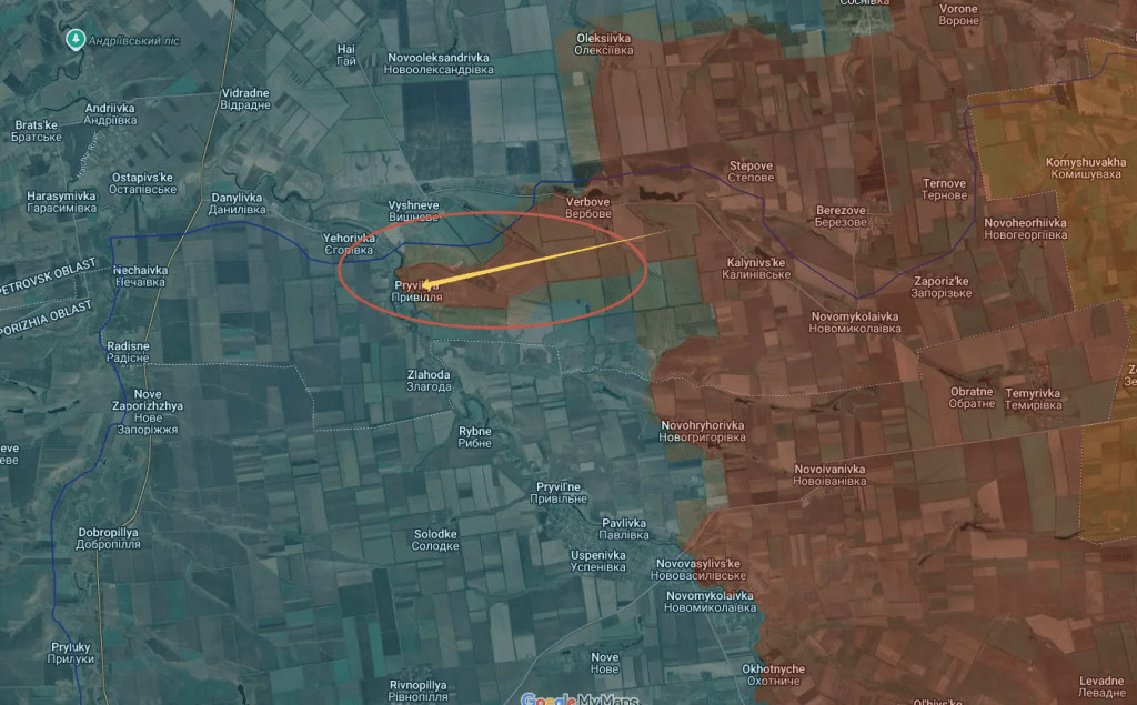 À l'extrémité orientale de Zaporijia, une percée majeure s'est produite à partir de Verbove vers la chaîne de colonies de la rivière Yanchur, capturant la petite colonie de Pryvillya :